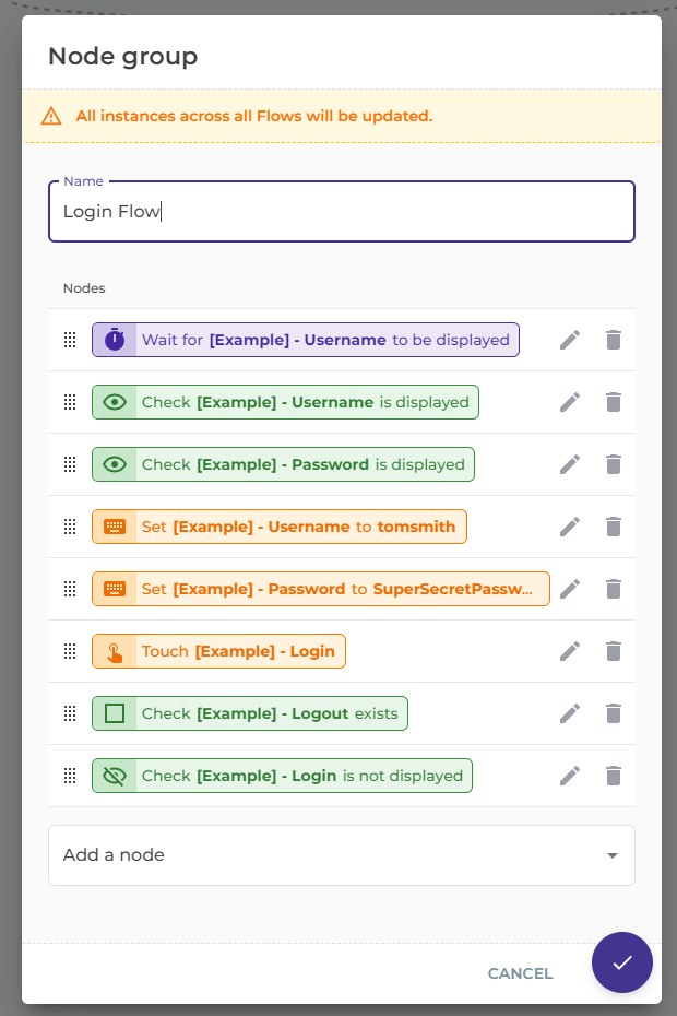 Once you have created a Node Group, you are able to use these across all flows, they are selectable from the node menu on the flow designer view.&#x20;